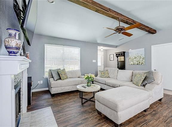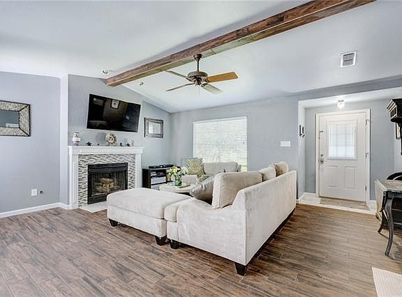 Remodeled in 2015, this inviting homes lives larger than it's size. Modern fireplace surrounded with a warm neutral wall color highlights the open living/dining area. Updated kitchen with stainless steel appliances (2015) and under-mount sink. Beautiful tile floors throughout great for pets. Entertain friends and family on the large wood patio out back. Grill out and relax surrounded by tons of trees and privacy created by greenspace behind the property. HVAC replaced 2017.