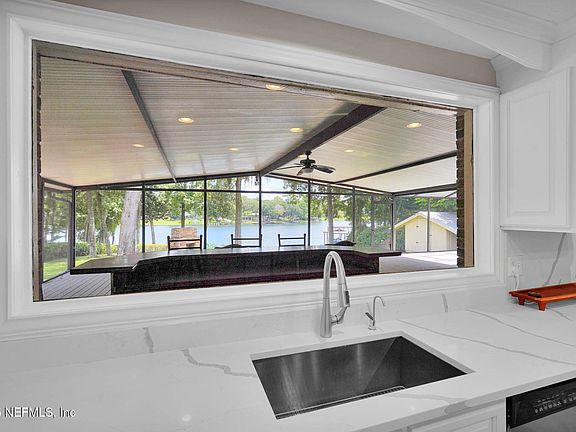 This beautifully updated 3-bedroom, 2.5-bath home offers elegance, flexibility, and an unbeatable indoor-outdoor lifestyle. At the heart of the home is a show-stopping gourmet kitchen, featuring designer quartz countertops with a waterfall edge, custom-painted maple cabinetry, and a massive glass picture window that perfectly frames the lake--filling the space with natural light and serene views.