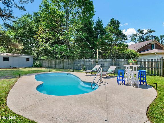 Step inside to find a charming split-level home with 3 spacious bedrooms, 2.5 baths, 2 separate living spaces, an office/flex room, and a large laundry room with storage. The kitchen is open to the dining area and overlooks the expansive backyard. For those with hobbies or recreational vehicles, the large two-car garage includes extra space for work or storage, while a second driveway leads to an aluminum carport, providing convenient storage for your boat or RV. Venture outside to discover your personal oasis—a fenced backyard featuring a spacious covered patio and a sparkling saltwater pool, perfect for endless summer fun. An outdoor building ready to use as a workshop or additional storage adds versatility to this already impressive property. Home is centrally located, has no HOA, no city taxes, and is conveniently located only 15-20 minutes from local beaches and downtown Wilmington.