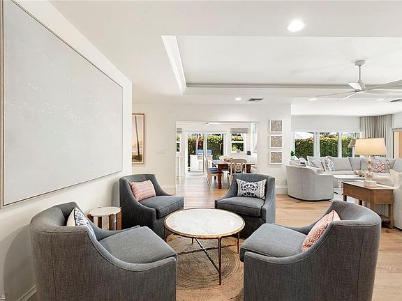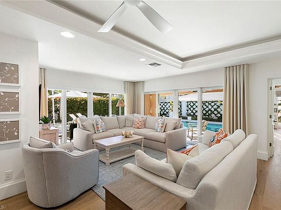 Charming and move in ready, this fully renovated Beauville residence in Pelican Bay lives like a single family home and offers the rare luxury of an oversized, fully walled double lot. Thoughtfully reimagined with sophisticated coastal style, the home features wide plank white oak flooring, beautifully appointed baths, and a chefs kitchen with white shaker cabinetry, Wolf gas oven, Subzero refrigerator, pull-out storage, and generous prep space designed for effortless entertaining. Architectural details and designer lighting elevate every room. A valuable layout enhancement adds flexibility for todays lifestyles, as the second family room has been converted into a true second VIP suite, ideal for visitors, multi-generational living, or long-term guests who appreciate privacy. Outside, the experience is pure resort living. Enjoy covered outdoor seating, a sparkling pool, built-in grill, and an expansive grassy yard framed by lush landscaping, bougainvillea, and dramatic evening lighting, perfect for pets, play, and hosting. Notable upgrades include impact windows and doors, newer roof, whole-house generator with buried propane, epoxy garage floor, and a coveted Zone X location outside the floodplain. Pelican Bay residents enjoy an unmatched coastal lifestyle with two private beach clubs featuring dining, miles of sandy shoreline, and a state-of-the-art tennis and fitness center, all moments from Waterside Shops, Mercato, and Artis-Naples.