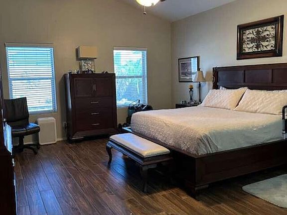 Outstanding 3BR 2Bath ranch with triple garage. Built by VIP Homes with 2x6 construction. Great room style living, dining and kitchen featuring 13ft. soaring ceilings. Plantation Blinds in the kitchen and living room. Features split bedrooms for privacy. 2 spare bedrooms and bath for guests. Amazing Primary Suite with vaulted ceilings and wood plank tile floors. Bathroom has a walk-in shower, dual sinks and walk-in closet. Kitchen has granite counters and large walk-in pantry, recessed lighting and small dining nook off of the kitchen. Good size storage closets. Washer and Dryer stay and laundry room also has sink. Garage floor is epoxy. The development is Sonoran Wells and has a small park area with grills and covered picnic tables. HOA dues $95 monthly. Resort style backyard with extended covered patio and saltwater pool. BBQ area with pavers and palms!