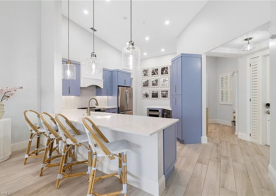 Welcome to Breakwater, Pelican Bay’s most coveted enclave of luxury coastal living. This three-bedroom, two-bath residence has been transformed into a showcase of modern elegance by Nicoletta & Co., one of Southwest Florida’s most celebrated design firms. While many homes in Pelican Bay require costly renovations, contractor coordination, and rising material expenses, this exceptional residence is move-in ready today, providing you with access to embrace the Naples lifestyle this season. Every detail of this renovation reflects thoughtful design and timeless sophistication. Throughout the home, wide-format 8x48 Jungle Bianco plank floor tile provides a luxury foundation that flows seamlessly from room to room. The reimagined kitchen features Fabuwood Galaxy cabinetry in a striking Ocean Blue finish, paired with Pompeii Quartz Avorio countertops. Bathrooms have been fully redesigned with today’s most sought-after finishes, while brand-new appliances, HVAC system, and water heater ensure lasting comfort and peace of mind. Positioned on the top floor, the residence is bathed in natural light and offers soaring ceilings that elevate the sense of space throughout. Three spacious bedrooms and two impeccably styled baths create an ideal setting for both entertaining and private retreat. Elevator access enhances convenience, while the oversized two-car garage equipped with electricity directly tied to the unit offers the option of a fully air-conditioned space. The Breakwater community itself has recently undergone extensive improvements, including new roofs and fresh exterior painting, with further enhancements underway. Located directly across from Bay Colony, Breakwater offers residents both privacy and proximity. And with a foundation membership in Pelican Bay, you’ll enjoy Naples’ premier lifestyle: private beach access, beachfront dining along the Gulf, world-class tennis, a cutting-edge fitness center, and miles of scenic walking paths shaded by mangroves. This is more than a residence it is a turnkey opportunity to immerse yourself in the unparalleled beauty and lifestyle of Pelican Bay. Skip the stress of renovations and step immediately into a home that embodies effortless sophistication.This rare, fully renovated gem in Breakwater is ready for you to enjoy this season with no delays, no stress, just pure Naples coastal living.