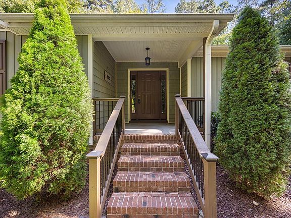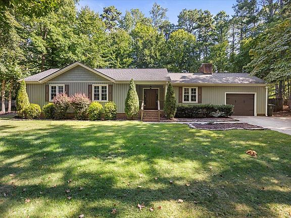 This ranch style home is located in a tree lined neighborhood, just like in a Hallmark movie. At the end of a cul-de-sac, the house sits on a pie shaped lot for maximum backyard space. Inside you'll see a large family room with wooden vaulted ceilings that make a statement. The wood burning fireplace with a brick face and custom mantle warms the room. The kitchen is updated with stainless steel appliances and marble countertops. There's enough space in the kitchen to add an island, if you wish. Three bedrooms with ceiling fans are down the hall, and the primary has a beautiful view of the serene backyard. The garage has a fantastic workshop for your next project. The backyard is truly a show stopper and so hard to find in North Raleigh. The wooded and fenced-in yard makes the perfect backdrop for entertaining on the hardtop pergola covered deck.