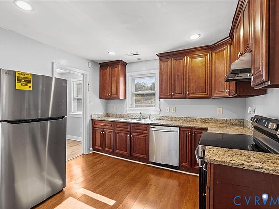 Move right in and enjoy one level living in this all brick ranch which is located in a most convenient area on .32 Acres. Beautiful newer wood flooring runs thro9ugh most rooms and new vinyl flooring is in the kitchen, utility room and hallway. Freshly Painted inside and out. There are three bedrooms which include a larger primary bedroom and 2 Full baths. The kitchen has been renovated and offers a new stainless steel range and refrigerator. The backyard is very large and fully fenced. and the deck is quite large.