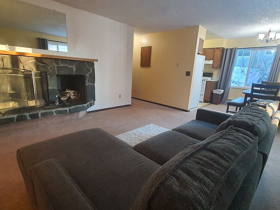 Bright living area with fireplace. King size bed in the big bed room. Full size bed in the small bedroom.