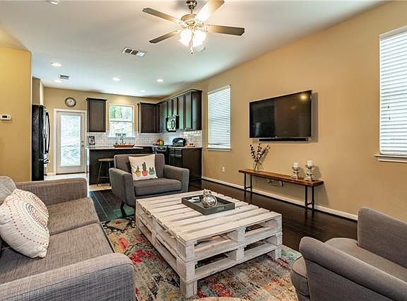 Want a home that feels new + shows like a model? Open floor plan w hardwoods throughout. Upstairs second living/flex space room. Formal dining or office. All bedrooms upstairs. Well-kept stone exterior. Large trees in terraced, low-maintenance backyard - feels like hillcountry greenbelt. Rustic front door. Just a few minutes from Mopac. Convenient location with nearby parks + pools. Inspection/info RE the back yard water flow in attached docs.