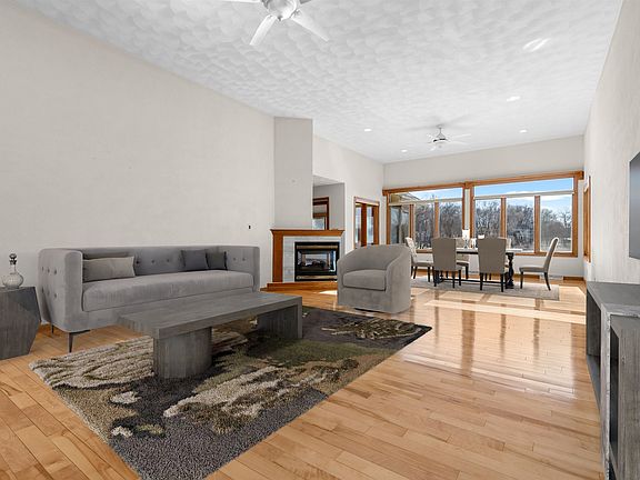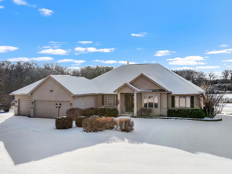 Experience the lifestyle Legend Lake has to offer in this meticulously maintained ranch. This home boasts over 4,100 square feet of living space, blending timeless finishes with the serenity of a lakefront setting. The main level features solid maple floors throughout and a welcoming foyer. The formal dining room showcases vaulted ceilings, while the living room impresses with 11-foot ceilings, a gas fireplace, and large transom windows that frame picturesque lake views. The spacious kitchen includes oak cabinetry, solid-surface countertops, an island with a movable solid-surface dining table, and white appliances with a double oven. An eat-in area fills with natural light and provides access to the sunroom, which features a ductless HVAC unit, knotty pine vaulted ceilings, recessed lighting, abundant windows, and deck access. Two generous guest bedrooms share a full guest bathroom, and the primary suite offers a walk-in closet and an en-suite bath with a double-sink vanity, a shower, and a jacuzzi tub. A convenient half bath is off the kitchen, and the large laundry area includes a sink, a folding station, and cabinetry. Access to the three-car garage is also available from the main level. The partially exposed lower level bathes in natural light and provides an expansive recreation room with ample space for a potential fourth bedroom. This level is ideal for entertaining with numerous windows and includes a kitchenette with a wet bar, a full bathroom, and extensive storage space. Mature shade trees and professional landscaping surround the property. A built-in storage shed is included, the deck is freshly painted, and the generous backyard offers direct access to the water. Updates include the air conditioning and furnace, both updated in 2024, and the hot water heater in 2021. This home lies within both the highly rated Hononegah and Prairie Hill school systems. It is five minutes from Ledges Golf Course and offers easy access to I-90 for a quick commute. Embrace the serene views, quality details, and the unique opportunity to make this lake home your own!