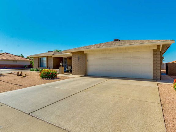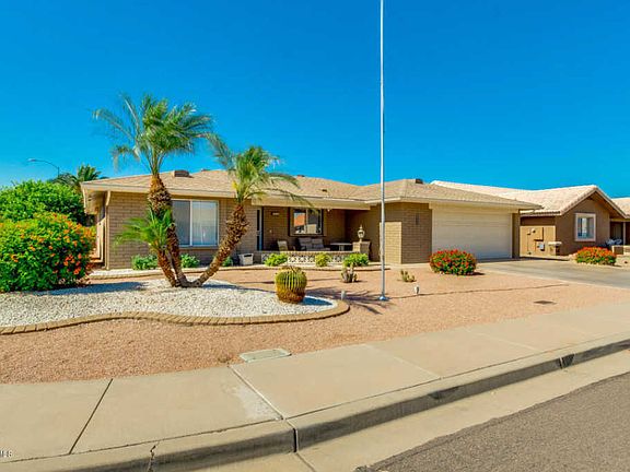 Sunland Village East Active Adult Community. Furnished and move in ready. Corner lot with citrus trees. Spacious, open, custom floorplan includes 2 bedrooms and a huge 13x18 bonus room plus a 13x28 air conditioned Arizona room, making actual living space 2285 sq ft. Large kitchen with island and breakfast bar. Lots of storage. Mechanical rollup shades and security doors provide peace of mind when traveling. The 5x12 separate laundry room includes a washer/dryer, soaking sink, a solar light, and cabinets. 2 year old air conditioner is still under the protection plan. Garage floor, driveway and front porch floor are epoxy coated. 2.5 car Garage has built in cabinets and access to attic storage space. Adult community with golf course, softball field, tennis courts, heated pool, rec center.