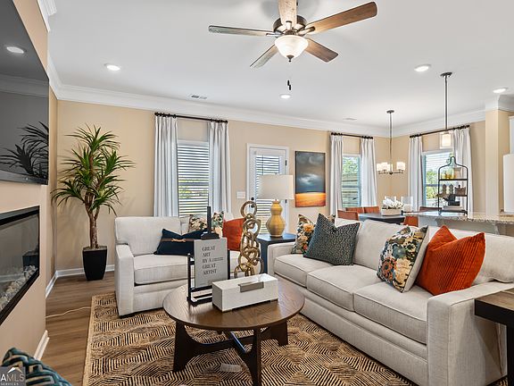 Move in Ready February 2026! The Norwood II plan by Smith Douglas Homes in Crescent Towns! This thoughtfully designed 3BR/2.5BA end-unit townhome offers comfort, convenience, and functionality throughout. The spacious two-car garage opens to a mudroom and coat closet-perfect for everyday storage and organization. The open-concept main level features a stylish kitchen with a center island, upgraded cabinetry, and granite countertops, seamlessly connecting to the cozy breakfast nook and inviting family room. From here, step out to the back patio and yard-ideal for relaxing or entertaining. Durable, easy-care vinyl plank flooring enhances all main living areas. Upstairs, the private primary suite is tucked away at the back of the home, while two secondary bedrooms and a full bath sit at the front. A versatile loft offers the perfect spot for a home office, study area, or playroom. The convenient second-story laundry room includes a utility sink for added functionality. Nine-foot ceilings on both levels create a spacious, airy feel throughout. Residents will also enjoy a planned community pool with cabana and lawn maintenance included through the HOA-making this home as effortless as it is elegant. Photos representative of plan not of actual home. Agent is not onsite at present time. Please contact Wendy Williams @ 470-629-0220 for further information and to set up an appointment.