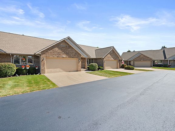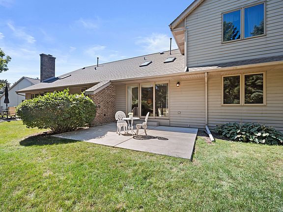 Proud to introduce this lovely townhome nestled in the Grandview Townhome community, presenting a backyard patio with a panoramic view of evergreen and pine trees! The covered porch welcomes you into the spacious foyer with wood parquet flooring and an open staircase. Folding shutter doors lead you in the inviting kitchen offering an open park-like view from the breakfast nook, tile backsplash, pantry with pull-out drawers, and fully applianced. The Dining Room boasts a vaulted ceiling and a fancy crystal-like chandelier. The vaulted ceiling flows into the Living Room showcasing two skylights and a beautiful marble surround gas log-lit fireplace with a soft white mantle. This cozy space opens up to a concrete patio with a semi-private setting and a view of mature trees. There is a main-level primary bedroom suite that features a walk-in closet, separate shower and toilet space, and vanity with tile backsplash detail. The second bedroom hosts tweed textured wall detail and swag light fixtures. A linen closet and full hallway bath offer added nearby convenience. A main-level laundry room is equipped with a washer, dryer, utility sink, cabinets, utility closet, and a coat closet. This floor plan offers a 2nd level guest suite or space for generational living! Enjoy this 3rd bedroom with views of the outdoor evergreen trees, vaulted ceiling, 2 closets, and a full private bathroom. Pella wood windows and a 95% Ruud furnace allow for warmth, comfort, and energy efficiency. There is a concrete driveway and additional parking to accommodate your visiting family and friends. Situated on a cul-de-sac street near restaurants, grocery stores, shopping, parks, walking paths, hospitals, and entertainment, this is home sweet Sycamore home!
