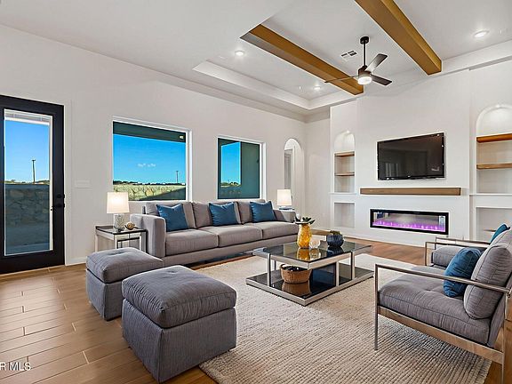 Modern fireplaceExpansive picture windowsStainless steel appliancesExquisite tile flooringElegant granite countertopsOpen-concept kitchenBeams on the ceiling