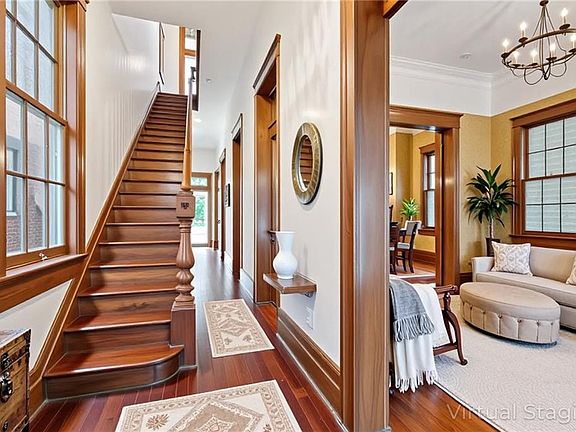 Pocket doorsSide hallLarge private backyardFloor to ceiling windowsFireplace mantlesTall ceilings