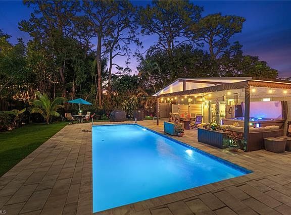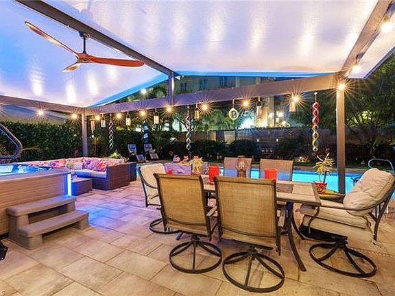 Situated just minutes from award-winning beaches and vibrant downtown Naples, this luxurious coastal cottage west of 41 in the city of Naples provides a gorgeous, peaceful retreat with all the amenities of a first class resort. This beautiful home has been professionally designed in keeping with the home's mid century modern architecture. It features two updated bedrooms and bathrooms. Both bedrooms have comfortable king size beds. The master bedroom has an ensuite bathroom. There is also a daybed with trundle in the living area that can accommodate two additional guests. Perfectly situated on a quiet street with no through traffic. Outside, your private backyard retreat awaits. The fully fenced yard features a temperature controlled saltwater pool. An above ground spa sits under a covered patio, and an abundance of seating provides plenty of space for entertaining, barbequing or relaxing. Walking distance to Clam Pass Park, Seagate Beach, Waterside Shops, and Artis-Naples/Baker Museum. Also within walking distance are many shops, restaurants, and grocery stores. Two bikes are also provided.