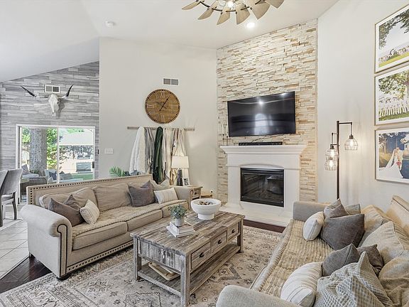 Step inside to discover high ceilings, fresh interior paint, wood-look flooring, and a spacious living area centered around a stone fireplace—perfect for entertaining family and friends. The kitchen features granite countertops, stainless-steel appliances, and a custom tile backsplash, offering both style and functionality.