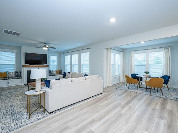 Gas fireplaceLarge kitchenBeautiful white cabinetryCenter islandOpen floor planCovered patioAbundance of natural light