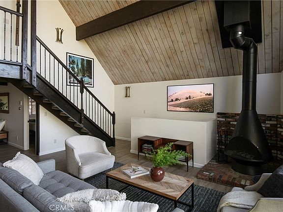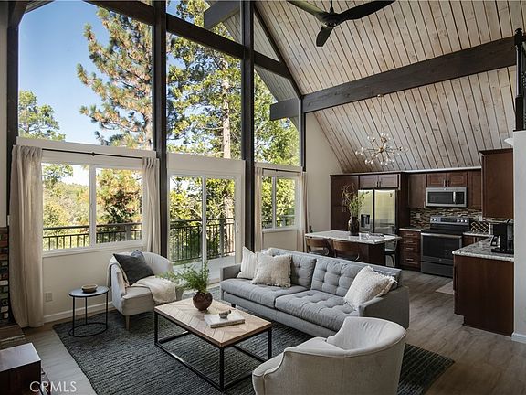 Discover your mountain escape in this inviting prow style retreat, where forest views and seclusion set the stage for a perfect getaway. Step inside to vaulted ceilings and an open layout that seamlessly blends the kitchen and living area, with a stunning wall of windows that frames the natural beauty of towering trees. The main level offers two comfortable bedrooms and a full bath, providing a cozy space for guests. Upstairs, the lofted primary suite offers privacy with an en-suite bath and walk-in closet, while still embracing the forest views from the main level. The lower level boasts a versatile entertainment room that doubles as an extra bedroom, with direct access to the backyard for relaxing outdoor moments. With level parking, just a few steps to the front door, and lake rights, this fully furnished home is ready to become your ideal mountain retreat or a sought-after rental. Only minutes from the golf course, country club, and Lake Arrowhead Village, this property offers the mountain lifestyle you’ve been dreaming of.