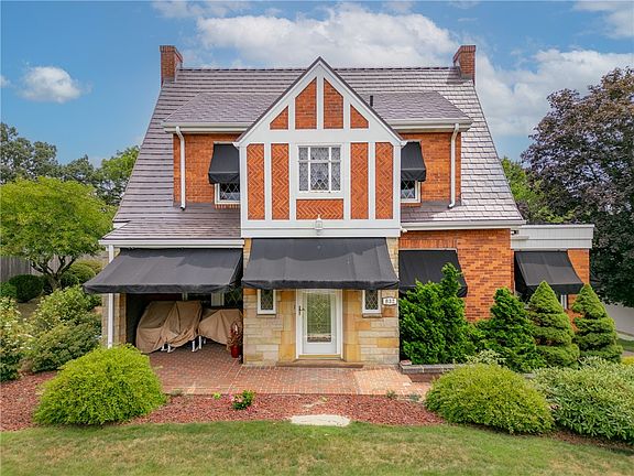 This long-admired Tudor blends timeless charm with modern comfort. Striking new metal roofs (2024) on all structures add architectural interest and peace of mind. The main home features 4 bedrooms, 3 full baths, original woodwork, soaring ceilings, and elegant updates throughout. The first floor offers a formal living and dining room, bar area, large eat-in kitchen, sunroom, full bath, and flexible bedroom/den. Upstairs are 3 bedrooms and an opulent full bath. A finished lower level adds bonus space with a fireplace, laundry room, full bath and storage. Step outside to your private retreat and admire the professional and pristine landscaping that highlights the custom-built pool house (2009), complete with vaulted ceilings, Pella windows, fireplace, open-concept kitchen, and full bath—perfect for entertaining. Thoughtfully maintained and updated, this home is a rare opportunity to own a character-filled property with standout features and modern upgrades in a convenient location.