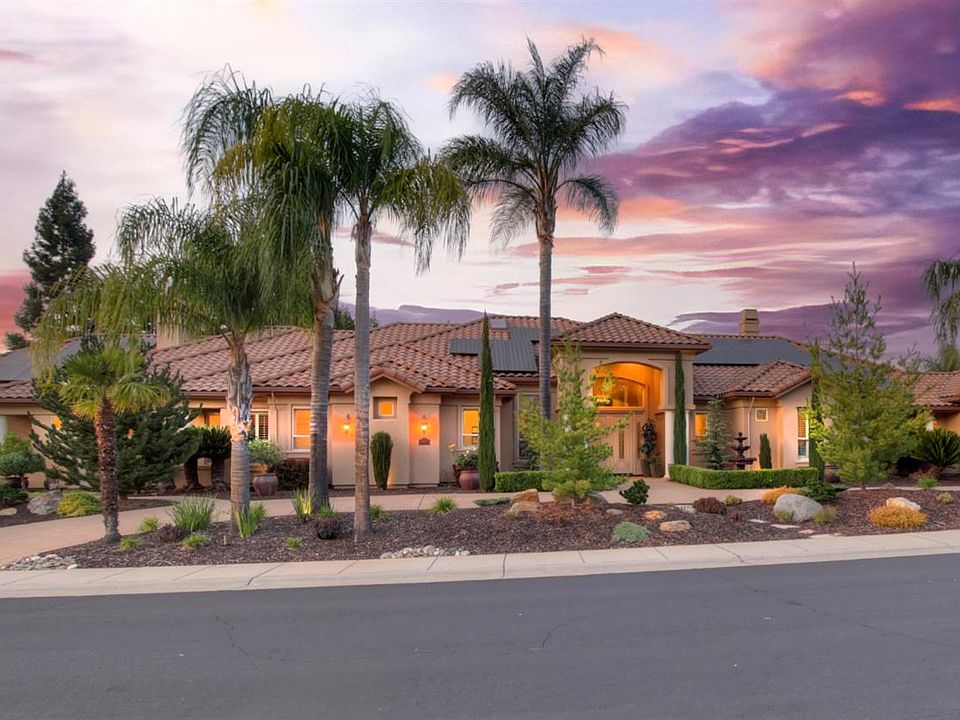 Elegant Mediterranean Villa on Half-Acre Corner Lot with Resort-Style Backyard. Custom-built by John Propp with designs by Julie Smith, this stunning single-story Mediterranean estate sits on a level 0.5-acre corner lot and offers luxurious living with exceptional craftsmanship and thoughtful updates throughout. Featuring 4 spacious bedrooms, a stately office, 3 full bathrooms, 2 half baths, and a 4-car garage with extra storage room. The interior showcases a sumptuous primary suite with a custom stone fireplace, Savage custom cabinetry, designer window coverings, premium finishes, surround sound, and central vacuum system. The gourmet kitchen is equipped with a Sub-Zero refrigerator, 2022 Thor range and dishwasher, and a 2023 microwave. Additional recent upgrades include a new XL water heater (2022), new garbage disposal and faucet (2023), and a fully replaced HVAC system (2022), last serviced in 2025 (heat in March, A/C in August). Step outside to your own private resort-style oasis, professionally landscaped in 2017. Enjoy a heated pool and spa, multiple fire-pits, tranquil waterfalls, and a built-in BBQ perfect for entertaining or relaxing in serene luxury. owned solar (installed 2017). This is a rare opportunity to own a move-in-ready estate at prestigious Douglas Ranch.