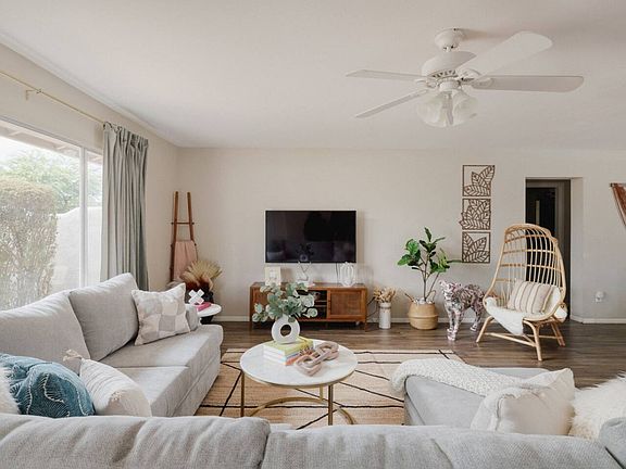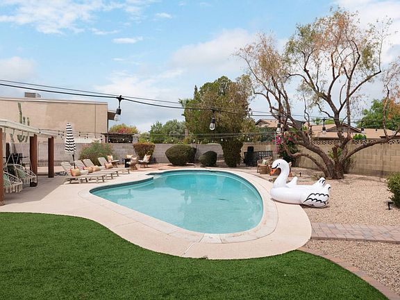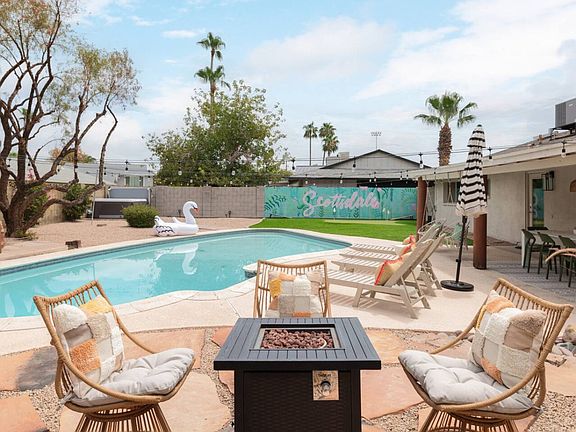 The Boho House is the perfect retreat for a Scottsdale getaway, featuring four bedrooms and three bathrooms, comfortably accommodating up to ten guests. This well-equipped home offers a heated pool, hot tub, firepit, and putting green, ensuring there's something for everyone to enjoy. Ideal for families, bachelorette parties, or groups of friends, this property promises a memorable stay with outstanding attention to detail and cleanliness as a top priority. This vacation rental offers a spacious living area and a large backyard with numerous games and activities, making it an ideal destination for large groups or families. The well-equipped kitchen and high-speed wireless internet ensure a comfortable stay. The primary bedroom features a king-size bed with an en-suite bathroom, closet, and TV, while the other bedrooms offer a variety of sleeping arrangements, including queen, full, and twin beds. The living room also includes a TV for entertainment. Pool heating is available from October 15th to May 15th for an additional $75 per day, ensuring a comfortable swimming experience during your stay. Guests can also take advantage of additional services such as fridge stocking, decoration packages for special occasions, and private yoga sessions, all designed to enhance your stay. Located just a short drive from Oldtown Scottsdale and numerous golf courses, this property offers easy access to local attractions and activities. Guests have the entire house to themselves and can access it via a keypad code provided once the house is ready for check-in. Your safety is important, and there is a camera in front of the house. The driveway is available for guest parking.