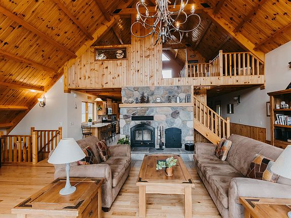 This is a rare opportunity to own a stunning timber frame custom home nestled on 40 acres of serene, private land featuring meticulously groomed trails, vibrant gardens, and peaceful ponds. Crafted with heart and soul, this 3-bedroom, 3-bathroom home showcases a striking stone fireplace, soaring 20’+ ceilings in the living room, and large windows that flood the space with natural light and offer breathtaking views of the surrounding wilderness. The main level features beautiful hardwood floors, granite kitchen countertops, custom cabinets, and rich beamed ceilings that add warmth and character throughout. The primary suite is tucked away on the upper level with its own full bath, while the walk-out lower level includes a spacious family room, two additional bedrooms, a 3/4 bath with a sauna, and a large pantry ideal for storage and canned goods. One of the standout features of this property is the extensive network of groomed trails winding through the 40-acre hardwood forest that borders Anna Gene county park. Whether you're hiking, biking, snowshoeing, or simply enjoying a peaceful walk, these well-maintained paths offer year-round enjoyment and a true connection to nature. The land also boasts an abundance of mature maple trees, perfect for syrup tapping, as well as open space for hunting and wildlife watching. Adding even more value is a separate 2-bedroom apartment that's 960 square feet with a full kitchen and living area located above the detached garage and workshop—ideal for guests, rental income, or multi-generational living. With access to nearby ATV and snowmobile trails, excellent hunting on thousands of acres, and fishing lakes just minutes away, this property is an outdoor enthusiast’s dream. Don’t miss this one-of-a-kind opportunity—schedule your private showing today before it’s gone!