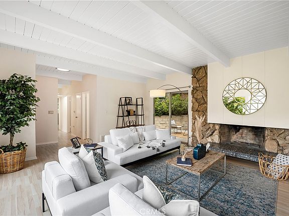 The spacious living room has high, wood-beamed ceilings that overlook a luscious treescape and the canyon. It has a beautiful stone fireplace and a sliding glass door that leads you out to the enchanting back patio.