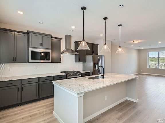 Stunning MOVE-IN READY three-story townhome with ROOFTOP DECK in Prospect Village at Sterling Ranch offers luxurious living with spectacular mountain views! Enjoy the expansive open great room with soaring 9’ ceilings on both the main and upper levels creating a bright and airy living space. The stylish chef kitchen features 42" charcoal gray cabinets, granite countertops, tile backsplash, and premium stainless Whirlpool® appliances including contemporary 5-burner gas range, hood, and built-in microwave. Relax in the luxurious owner's suite featuring an oversized walk-in shower with a bench and a spacious walk-in closet with access to the upper level laundry room. Separate bedroom and full bath on the entry level provide privacy and flexibility for guests or a home office. High-quality finishes and attention to detail are evident throughout the home offering both elegance and functionality. Sterling Ranch offers a wealth of amenities, including parks, walking trails, a clubhouse, and a state-of-the-art fitness center to enhance your lifestyle. This exceptional townhome is perfect for those who appreciate modern design, high-end finishes, and breathtaking mountain views. Schedule your showing today and experience unparalleled Colorado living!
