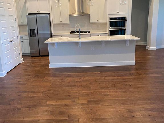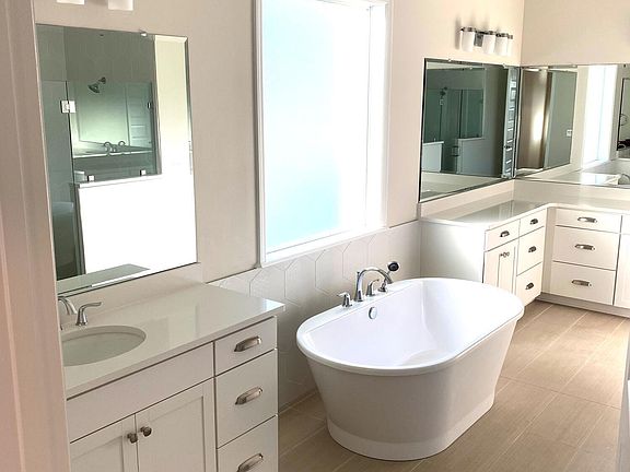 The kitchen features upgraded cabinets and countertops. The spacious master suite, located on the right side of the home, includes two walk-in closets and an en-suite bathroom with separate tub and shower. Three additional bedrooms are situated on the left side.