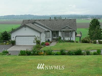 Unique home with awesome views of Mt. Baker, Three Fingers, and Pilchuck Mtns. Apprx 2570 sq. ft. situated on 1.5+ acre with 4 bedrooms, and 3 full baths. Home has two 2-car garages. Main level includes 3 bedrooms, 2 full baths, laundry, kitchen and living room. Master bath has separate jetted tub and shower. Lower level is fully self-contained with its own kitchen, full bath, bedroom, laundry and level entry from garage. Perfect home for mother in law, or having their own private living space.