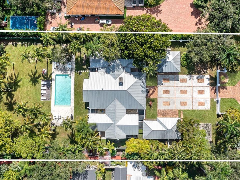 Key West style estate, situated on a sprawling 1-acre street to street lot in the desirable CORAL GABLES neighborhood. This 7,174 SF Total single-story home, 7 beds, 8.5 baths & 3-car garage, WITH HEIGHT TO FIT LIFT UP TO 6 CARS, which is any car collector's dream. Its prime location near top-rated schools, Gulliver, Carrollton, Ransom, and more. This Multi-Generational home is perfect for In-laws/professional kids returning home, with 3 detached rooms: office w onsite bath, 2 Beds w a sharing bath. The kitchen is complete w top-of-the-line appliances. The primary suite offers a spa-like bath & outside shower. Each of the 4 beds have en-suite baths. The outdoor area is an entertainer's paradise, featuring a covered terrace, a pickleball court, and a stunning pool w a detached cabana bath.