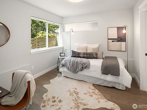 Nearly new & duplex-style with just one shared wall, this Crown Hill townhome lives large with high ceilings and walls of windows. Very spacious with 3 beds, 4 baths and private rooftop deck. You’ll find designer touches throughout, characteristic of revered builder, BriKat Homes. The lower level has a guest suite with private bath. An open concept main floor is made for gathering whether it's near the gas fireplace or around the kitchen bar. The upper floor has a primary bedroom with walk-in & en suite bath, laundry, and an additional bedroom, full bath with soaking tub. Enjoy rooftop views of Mt. Rainier, Downtown & beautiful sunsets. Living here is easy with automated blinds, A/C, EV charging in the garage & a walk score of 88. No HOA.