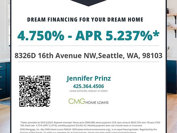 **4.75% FINANCING AVAILABLE** Presenting the largest, corner unit at the highly anticipated Nordic Heights community! This grand unit comes with a garage & welcomes you with a spacious entry, bed & bath on the lower level. You'll be hard pressed to find a more striking kitchen with an island & cabinets galore! Oversized windows bring in plenty of natural light in the great room. The upper level is a wonderfully appointed primary suite + secondary bed & bath. Your rooftop deck with views of the Olympics is such a delight! W/D included! With 9 hip units and 6 unique layouts, there's bound to one that checks all your boxes. Spectacular Loyal Heights location close to local amenities and everything that Ballard has to offer. Come visit today!