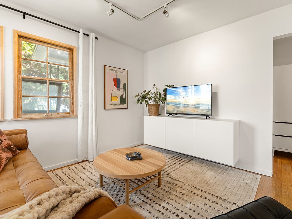 - Living room: Cozy sofa seating, flat-screen TV, modern coffee table, bright windows with natural light, minimalist decor with plants and artwork.