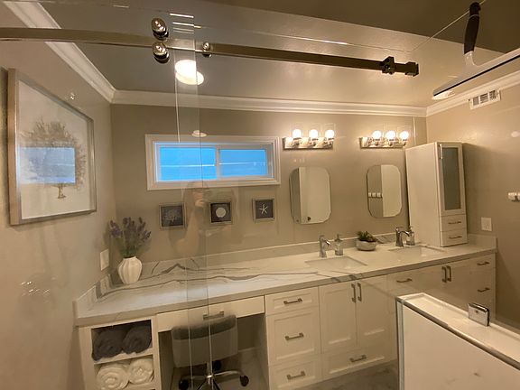 Master Bedroom with King bed, bed couch, TV, air conditioner, ceilling fan, 2 person desk, private bath with his and her sinks, large walk-in closet, sliding door for access to dog area, room darkening curtains.