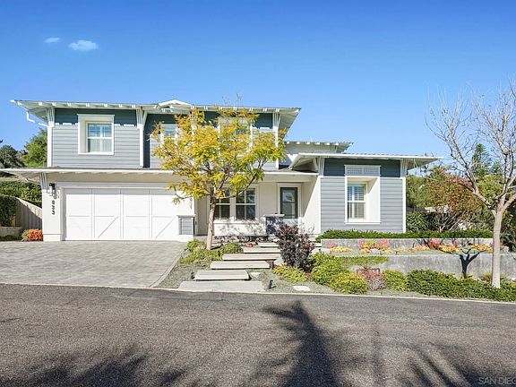 Completed in 2016, this stunning Coastal Plantation-style home exudes bright and sunny SoCal luxury from the moment you arrive. Welcome home to classic architectural curb appeal and landscaping, as well as high-end finishes covering the generously proportioned interior. Inside, an expansive great room layout combines the living and dining areas and gourmet kitchen in an airy open concept, with huge glass doors that vanish onto an incredible entertainer's yard. Effortlessly move to the secluded backyard hardscape to enjoy the outdoor kitchen, fire pit, and hot tub, the perfect space for gatherings with friends and family. The chef's kitchen is a cook's dream, featuring a huge island, extensive storage, and top-of-the-line GE Monogram appliances. Upstairs, the primary retreat boasts a spa-quality en-suite bath and a big walk-in closet. Upgrades include recessed lighting, custom paint, and surround sound. The home is also equipped with a 12 owned solar panels, for guilt-free green living and lower monthly costs, as well as a 3-car garage and additional driveway parking. All in a fantastic location of Encinitas, only moments from Encinitas Ranch Golf Course, the 5 freeway, vibrant shopping and dining, schools, and of course the beach! This home is a true masterpiece.