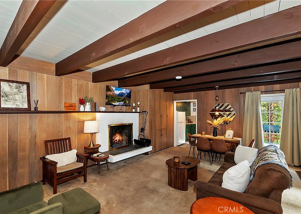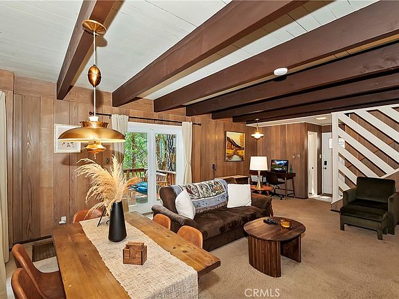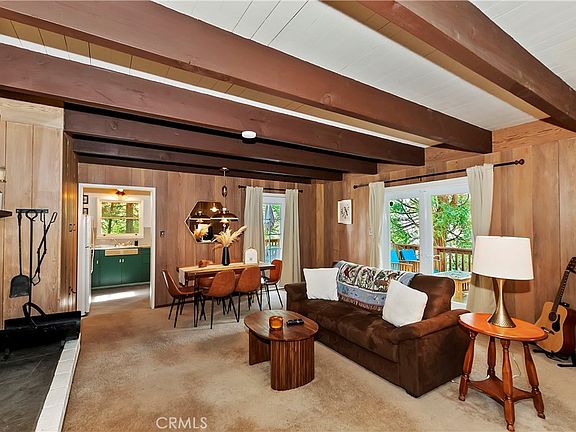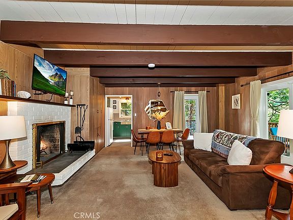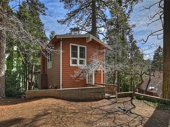 Beautiful mid-century, near level entry, cabin with gorgeous wood paneling and floating fire place. This modern time capsule has two bedrooms on upper level, with bathroom, and bathroom on lower level near entry. Deck is right off the living room and is connected to kitchen to give you a more circular flow in the space for all your indoor/outdoor entertaining. Bathrooms and kitchen have been updated while keeping the vintage charm. The home also has lower level storage for tools and seasonal items. The home is in the area of Lake Gregory and is near shops and dining. Last but not least, this home comes furnished! Check this midcentury charmer soon before it's gone.