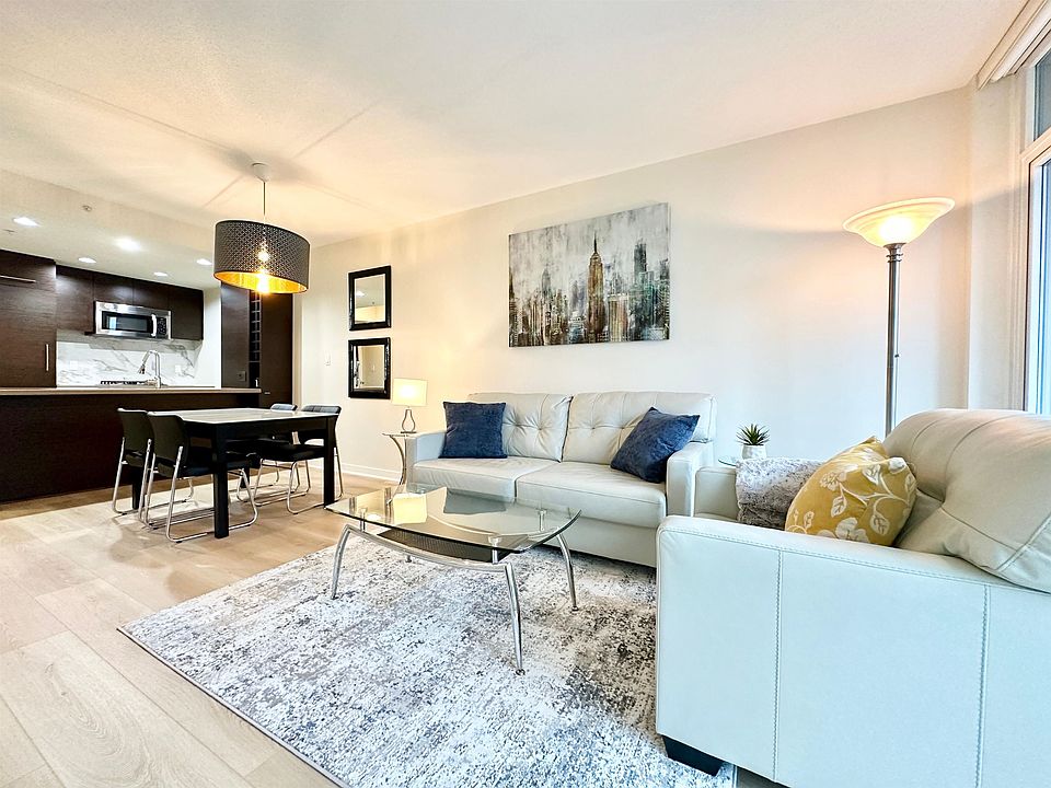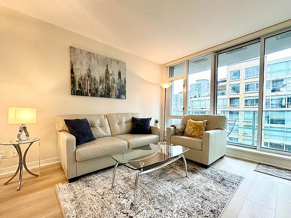Discover the pinnacle of urban living in this elegantly furnished condo in Vancouver. Spanning 690 square feet, this one-bedroom, one-bathroom residence offers a perfect blend of modern amenities and sophisticated design, ideal for those who appreciate both comfort and style. Step inside to find a bright and inviting space, enhanced by its south-facing orientation and stunning city views. The open-concept living area is complemented by an adjoining office den, providing a versatile space for work or leisure. The kitchen is a chef's dream, featuring stainless steel appliances and luxurious marble countertops, making meal preparation a pleasure.The bedroom offers a peaceful retreat, ensuring restful nights in the heart of the city.