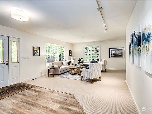 Location, location, location... Commuter's dream with just a short, safe sidewalk stroll to the ferry, town and schools. One level living at its best! Featuring fresh new interior paint, brand new laminate wood flooring and carpet throughout. Spacious easy flow from living, dining and kitchen. Large picture window with a cozy space to sit and sip your coffee while letting the outdoors in. Idyllic setting surrounded by mature rhododendrons, Japanese maple, hydrangea, lilac and azaleas. This beautifully maintained and updated home is everything you've been waiting for, impeccable and move-in ready. Gorgeous landscaped views from every window. Fenced backyard, bring the dog! Run don't walk! A must see! This one won't last.