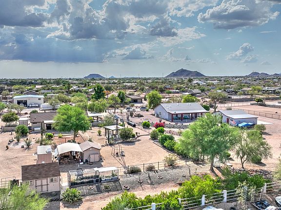NEW PRICE ALERT!! Welcome to your private desert oasis, nestled on a spacious horse friendly 1.2-acre lot with breathtaking views of the Superstition Mountains and 6 mi to Usery Pass . This well-maintained home welcomes horses (existing 14'x19' metal carport great start for shaded stalls) and offers true Arizona living with natural desert landscaping, fruit trees, and room for all your toys --all with no HOA restrictions for RVs, Boats, and Trailers. Step inside to find tile flooring throughout, a remodeled spacious kitchen featuring an open layout, Thomasville cherry cabinets , breakfast bar, and a cozy bay-window eat-in area. The open great room provides a welcoming space for gatherings, while the primary suite includes patio access and a beautifully updated ensuite bathroom. Storage is never an issue, thanks to two Conex containers and an attached side-entry garage equipped with built-in shelving and its own mini-split system for climate control. Additional upgrades include a metal roof with a transferable lifetime warranty, metal facia, a water softener and reverse osmosis system, copper kitchen sink, security screens, wood burning firepit, insulated garage, and remodeled bathrooms that add modern comfort and style. Relax in your spa as you star gaze. This acre has room in the East back (dry wash) for all your entertaining needs - horseshoes, corn hole, even room for volleyball. Make sure to stroll through the gate, over the bridge to this area. Bridge is an ideal spot to watch the sun rise and enjoy coffee! This property offers the perfect blend of privacy, functionality, and natural beauty. Come experience the peaceful charm of desert living with thoughtful upgrades throughout.