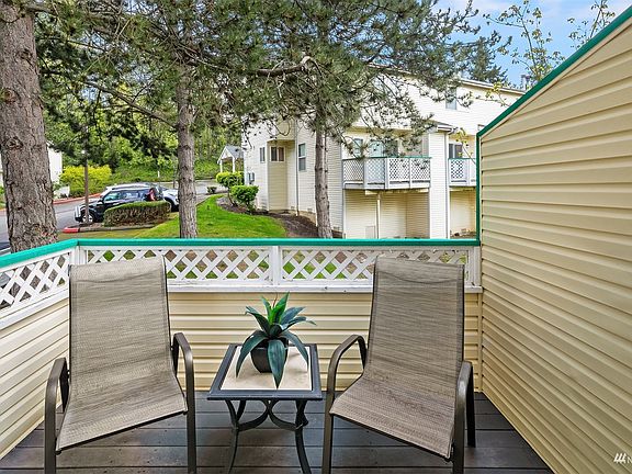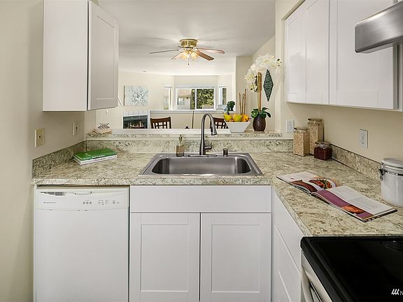 Come home to easy living in this bright and beautiful Sunpointe townhome! This prime corner unit is filled with natural light. Relax by the fireplace and bay window in the sunken living room, or host friends in the adjacent dining area. Beyond, a cheerful kitchen with stainless-steel stove and refrigerator opens to the sunny back balcony that overlooks the grassy common area. Two vaulted bedrooms await you upstairs, including a primary suite with private 3/4 bath. Downstairs, discover the huge extra storage room (300SF!) in the garage with built-in cabinets. Stroll to shopping, dining, and buses from this convenient location. Just minutes to I-405, Hwy 167 & light rail, too!