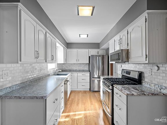 Located in West Aurora, this charming ranch home is much larger than it appears! Step inside and discover hardwood floors flowing throughout the residence, creating a warm and inviting atmosphere. The heart of the home is the inviting family room, featuring a beautiful masonry gas fireplace that serves as a stunning focal point. Imagine cozy evenings spent relaxing by the fire! The updated kitchen is a chef's delight, featuring some granite countertops, tile backsplash, newer cabinetry with pull out shelving and upgraded stainless steel appliances. Meal preparation will be a joy in this stylish and functional space. There is a spacious living room/dining room with large bay window. This fantastic home offers three comfortable bedrooms and a well-maintained updated full bathroom. The full bath features a walk-in shower. While the home has central air, there are also 2 window units in 2 of the bedrooms for added comfort. Convenient 1st floor laundry/mudroom with tile flooring is a great size & is located right off the garage entry. Step outside and discover your own private oasis. A lovely trex deck provides the perfect spot for outdoor dining and entertaining, overlooking the beautiful, fenced backyard with flower beds. Enjoy the tranquility and privacy this outdoor space offers. Adding incredible value is a large shed and a fantastic workshop, complete with electric and heat. This is a dream space for hobbyists, DIY enthusiasts, or anyone needing extra storage. Wide concrete driveway. The roof was replaced in 2024. Water heater replaced in 2021. Brand new washer & newer refrigerator. No steps to access the home with the front concrete ramp. No steps to access the deck from the family room. Great location close to schools & shopping. Schedule your showing today!