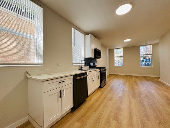 Fully renovated 2BR / 1BA, ~550 sq ft. Modern kitchen with granite countertops & stainless steel appliances (fridge, stove, microwave, dishwasher). In-unit washer/dryer. Central heating & cooling. Both bedrooms fit king beds. All new plumbing, gas lines, electrical, windows, and paint. Parking garage is available.