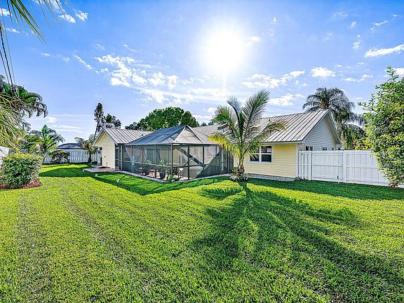 Welcome to this meticulously maintained, custom-built home nestled in the serene community of Quail Ridge in Hobe Sound. As you step inside, you're greeted by a brightly lit space and a well thought out floor plan. Notable features inside the home include laminate flooring, cultured marble sinks in the bathrooms, closet built-ins, and framed windows. Beautifully appointed kitchen featuring stainless steel appliances, with the stove, dishwasher and microwave upgraded in 2023. The Primary bedroom boasts sliders leading onto the patio, complete with closet built-ins and a cabana bath for added convenience. Hardi plank siding, metal roof, and impact windows and doors, all contribute to the home's durability. Vaulted ceilings add to the spacious feel, while a well-appointed laundry room and extra deep garage offer practicality. Your screened-in patio, featuring Mexican tile, and the fenced backyard provides privacy and a safe space for outdoor enjoyment, with a sprinkler system making yard maintenance effortless. New garage door in 2021, new AC in 2022, and new screen for the screened in patio in 2022 and freshly painted patio in 2022.