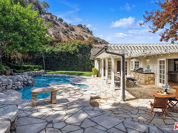 This exceptional 3,556 sq.ft. single-story Mid-Century Ranch, updated with Contemporary finishes, sits behind stately private gates, offering a rare opportunity for an unfurnished minimum one-year lease. Impeccably maintained and blending timeless charm with modern luxury, the home is ideally located in the coveted Laurel Hills neighborhood, within the acclaimed Wonderland Avenue Elementary School district and near the Mulholland Tennis Club. The property offers complete privacy, lush landscaped grounds, and effortless indoor/outdoor living. Inside, you'll find 5 bedrooms and 3.5 bathrooms, including an expansive double primary suite retreat with vaulted high ceilings, a cozy sitting area with fireplace, white paneled walls, a private office nook, a spa-quality bathroom with soaking tub and separate shower, and an expansive walk-in closet. Four bedrooms are thoughtfully positioned on one side of the home, while a private fifth bedroom with its own bath is located on the opposite side ideal for guests or staff. The expansive step-down living room with pitched beam ceilings, a gas fireplace, and oversized windows flows seamlessly into the formal dining room, a stylish wet bar, and a comfortable lounge. The gourmet kitchen is outfitted with top-of-the-line appliances, granite countertops, a breakfast area, and an eat-in island all opening directly to the backyard for easy entertaining. Wide-plank walnut wood floors, fresh paint, wood-paned or triple-paned windows, and elegant lighting fixtures enhance the home's warm yet sophisticated feel. The backyard is a true private oasis, featuring a sparkling heated pool and spa, a sun deck with built-in BBQ, a grassy lawn, and multiple lounging spaces perfect for dining al fresco or hosting. With its flat lot and perfect indoor/outdoor flow, the home is equally suited for relaxed living or large-scale entertaining. This gated retreat not only offers resort-style living but also eco-conscious luxury with solar panels and an EV charging station, helping to keep energy costs low. Located just off Mulholland Drive and minutes from both the Westside and the Valley, this rare offering combines comfort, style, and convenience in one of Los Angeles's most desirable neighborhoods.