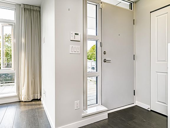 Parkside living and resort style amenities at Avanti by Polygon! Come see this bright and beautiful 2-bedroom townhouse in a concrete, air-conditioned building. This home is in great condition with a fresh coat of paint and laminate/hardwood flooring throughout. Convenient access with two entry points. Enjoy a direct view of Aberdeen Neighbourhood Park - the city's newest oasis of trees, shrubs and flowers. Building amenites at Avanti Club span over four levels where residents can enjoy a gym, dance/yoga studio, lounge, music room, garden space, and rooftop deck with a pool & hot tub. Located within walking distance to transit, shopping, restaurants and everyday needs. A complete package with one parking stall and one storage locker. Come live the sweet life on Sweet Avenue!