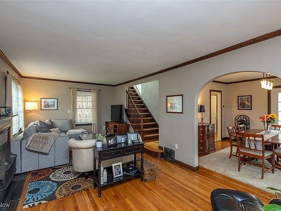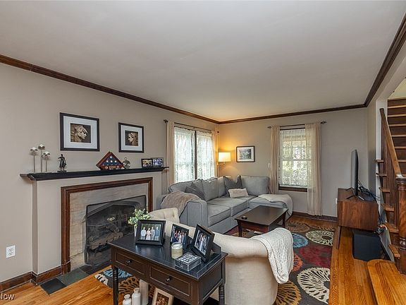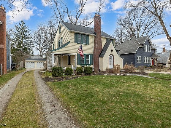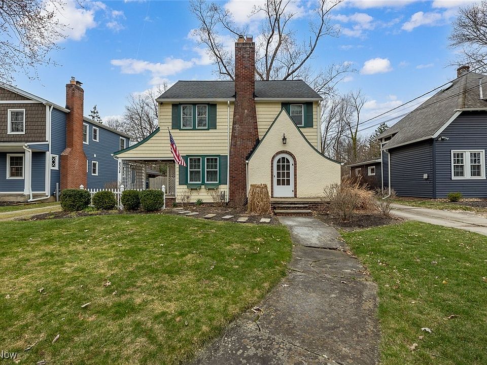 Nestled in the heart of Olmsted Falls, this lovely Tudor style home offers the perfect blend of timeless charm and modern updates. Featuring 3 spacious bedrooms, 2 full bathrooms, a versatile bonus room, and a finished attic, this home has everything you need for comfortable living. The exterior showcases newly installed vinyl siding, gutters, and 9 replacement windows on the back side of the house, all completed in 2021. Inside, the living room welcomes you with beautiful wood floors, elegant crown molding, and a cozy fireplace, creating a warm and inviting atmosphere. The wood floors and crown molding extend into the formal dining room, where you'll find a curved doorway, built-ins, and a door leading to the covered porch, perfect for relaxing or entertaining. The eat-in kitchen, tastefully updated in 2020, boasts new cabinetry, countertops, backsplash, recessed lighting, flooring, and included appliances. An updated full bathroom w/ jetted tub completes the main level. Upstairs, you'll find 3 comfortable bedrooms, a bonus room that could easily serve as a fourth bedroom, a second updated full bathroom(2017), and access to a charming balcony, ideal for enjoying the outdoors. The third level, a finished attic, offers additional living space for whatever your needs may be. The full basement provides ample storage and laundry area. French drains put in 2014; Furnace 2023, Hot water tank 2016 & Electrical panel updated 2017 and a 1 year home warranty provided. Outside, the two-car detached garage with carriage style doors, a storage building w/ heat and electricity, deck and a patio area create the perfect outdoor retreat. The backyard offers plenty of space to enjoy, and the property is conveniently located near schools and the picturesque downtown Olmsted Falls. This home is truly a gem!