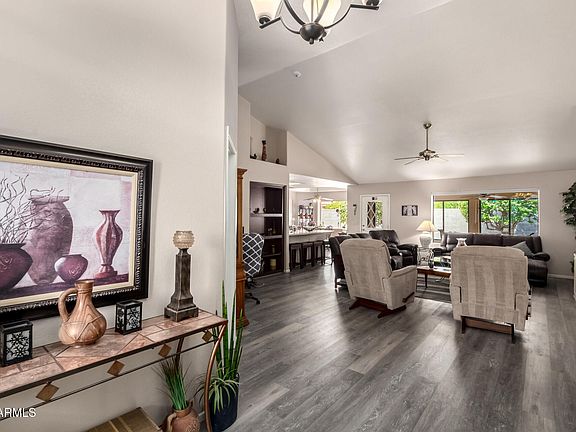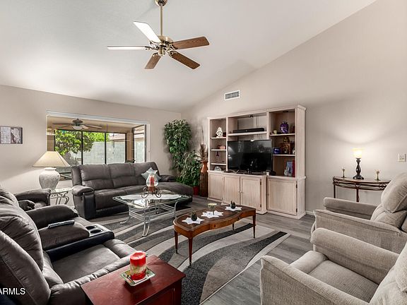 But the magic doesn't stop there! Step into the Arizona Room, a fantastic indoor-outdoor space where ceiling fans keep things comfortable all year long. From here, head out to your enclosed backyard oasis, complete with four mature fruit trees, offering fresh citrus and a peaceful retreat to enjoy sunny Arizona days.