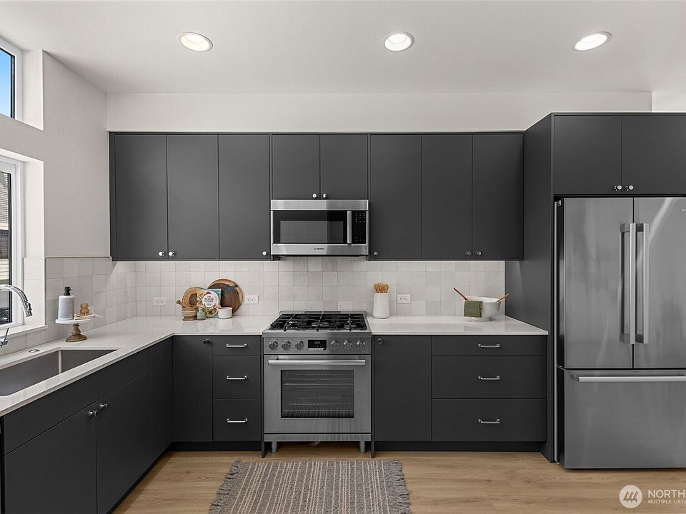 Welcome to Willow 12th by Shelter Homes. This 1,801 sqft features a gas cooking range, stainless steel appliances & luxury 2cm quartz countertops throughout. Find courtyard access, two bedrooms, a full bath, & utility room on the entry level. A spacious second floor w/ large living, dining, & kitchen spaces as well as a 1/2 bath. The third floor holds both the primary bedroom & a 4th bedroom-easily a nursery, office, or workout room. The top level boasts a private roof deck complete w/ gas, perimeter lighting, water spigot & outlets. In the alley is the deeded parking spot - EV-capable! Area spots inc. Soundview Playfield, Baker Park, Golden Gardens, & dining/shopping, inc. Met Market, w/in a few blocks. LOW HOA/NO rental restrictions!!