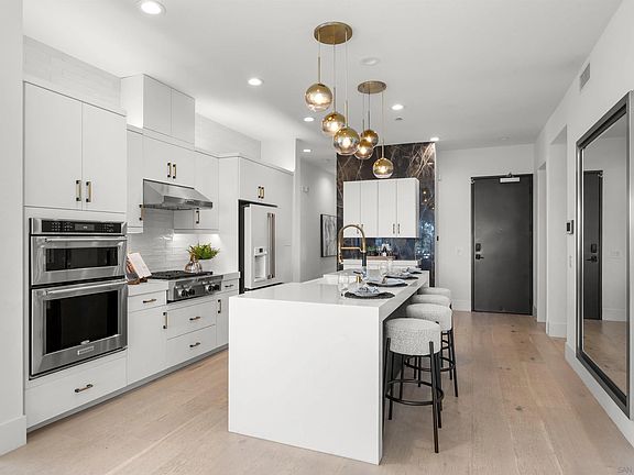 Welcome to this custom single-level residence offering 3 bedrooms, 2.5 baths, and 1,666 sq. ft. of refined living space. Your private two-car garage with epoxy flooring, custom cabinetry, and built-in storage opens into a shared entryway where you can take the stairs or ride the elevator directly to your home. Interior Highlights: Walls of glass and a wrap-around balcony showcasing stunning views Malibu wood flooring throughout with new bedroom carpeting Gourmet kitchen with 4-inch quartz counters, designer backsplash to the ceiling, custom-paneled refrigerator, coffee bar, and an impressive 8’x5’ walk-in pantry $4K washer/dryer included Designer lighting and upgraded electrical throughout Built-in electric fireplace in the living room Spa-inspired bathrooms with custom cabinetry and marble showers, including a rain shower in the primary suite Custom built-ins in every closet; secondary bedroom features a dresser, desk, and smoked-glass closet doors Community Lifestyle: At Lucent, residents enjoy their own private pool, reserved exclusively for just 66 homes, offering a boutique luxury atmosphere. You’ll also have access to the award-winning Civita Master Recreation Center, featuring: Two expansive resort-style pools, including one with beach entry Two-story gym and yoga studio Large event space with gourmet chef’s kitchen, available for private reservations Outdoor fire pits and gathering spaces Location: Perfectly situated near schools, shopping, dining, and freeway access — and only minutes to the airport, beaches, and downtown San Diego !