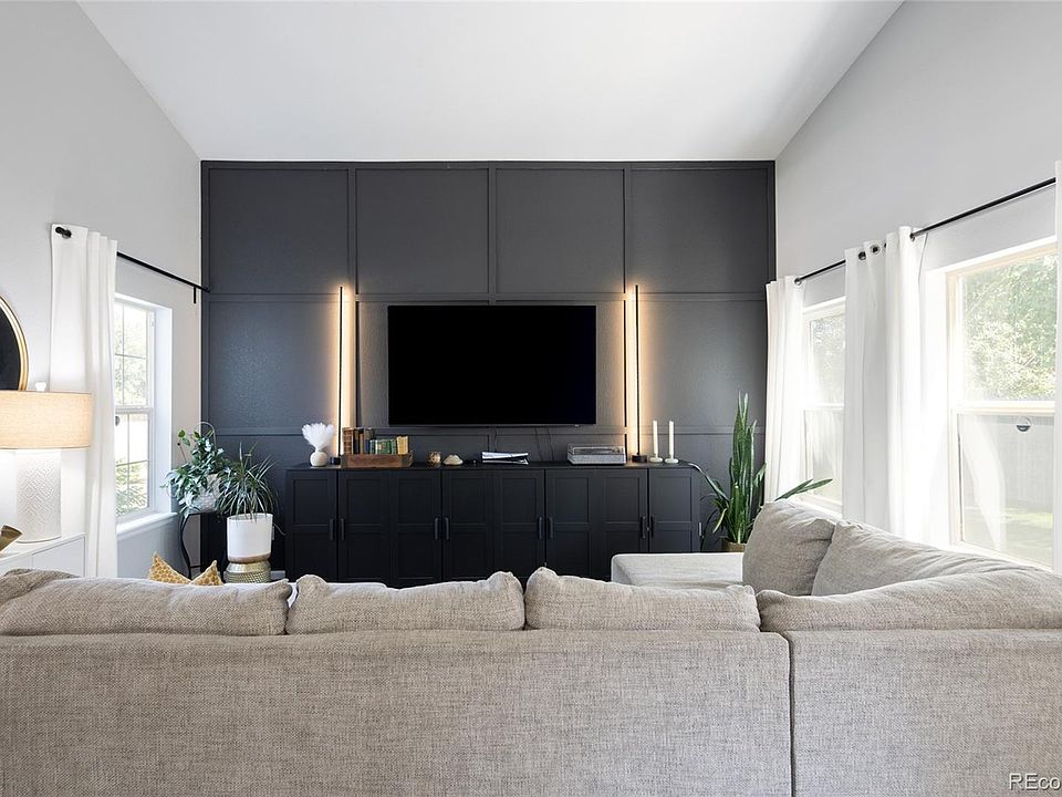 Extra-large corner lotFinished basementSoaring vaulted ceilingsChic two-tone designSouthern exposureBold black accent wallNewer wood-look laminate floors