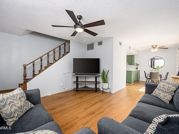 Welcome to this beautiful 2 bedroom townhome in Mesa that features upgraded wood laminate flooring throughout including the stairs. No carpet! You'll love the elegant wood French sliding patio door that leads to a HUGE enclosed private backyard with plenty of room for entertaining. The newer dual pane windows ensure that the interior of the home stays quiet. This townhome has a ton of extra storage spaces including a large closet just inside the front door, a large storage closet in the backyard, and a huge storage area in the attic which can be accessed using the brand new drop-down stairs. The upstairs bedrooms feature vaulted ceilings. The laundry and pantry are located next to the kitchen. Easy access to shopping, dining, entertainment, and the freeway. Check out the 3D Virtual Tour.